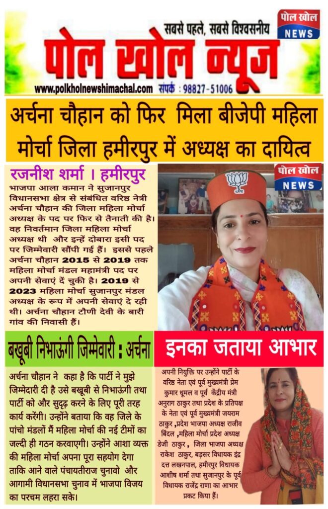 भाजपा आला कमान ने सुजानपुर विधानसभा क्षेत्र से संबंधित वरिष्ठ नेत्री अर्चना चौहान की जिला महिला मोर्चा अध्यक्ष के पद पर फिर से तैनाती की है। वह निवर्तमान जिला महिला मोर्चा अध्यक्ष थी और इन्हें दोबारा इसी पद पर जिम्मेवारी सौंपी गई हैं। इससे पहले अर्चना चौहान 2015 से 2019 तक महिला मोर्चा मंडल महामंत्री पद पर अपनी सेवाएं दें चुकी है। 2019 से 2023 महिला मोर्चा सुजानपुर मंडल अध्यक्ष के रूप में अपनी सेवाएं दे रही थी। अर्चना चौहान टौणी देवी के बारी गांव की निवासी हैं। अपनी नियुक्ति पर उन्होंने पार्टी के वरिष्ठ नेता एवं पूर्व मुख्यमंत्री प्रेम कुमार धूमल व पूर्व केंद्रीय मंत्री अनुराग ठाकुर तथा प्रदेश के प्रतिपक्ष के नेता एवं पूर्व मुख्यमंत्री जयराम ठाकुर ,प्रदेश भाजपा अध्यक्ष राजीव बिंदल ,महिला मोर्चा प्रदेश अध्यक्ष डेजी ठाकुर , जिला भाजपा अध्यक्ष राकेश ठाकुर, बड़सर विधायक इंद्र दत्त लखनपाल, हमीरपुर विधायक आशीष शर्मा तथा सुजानपुर के पूर्व विधायक राजेंद्र राणा का आभार प्रकट किया हैं।