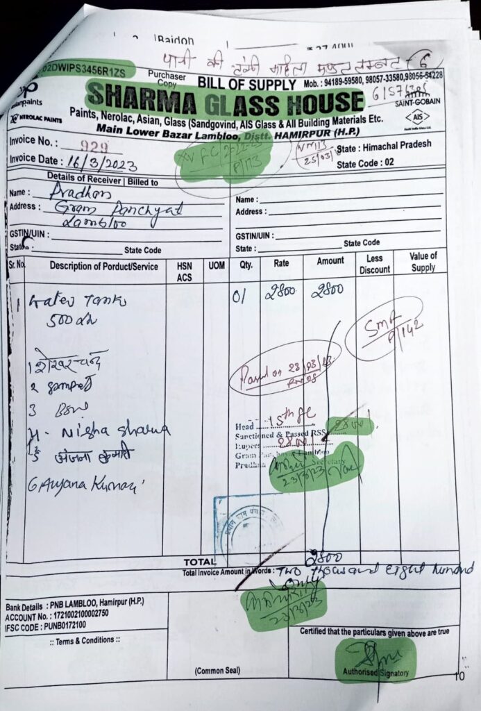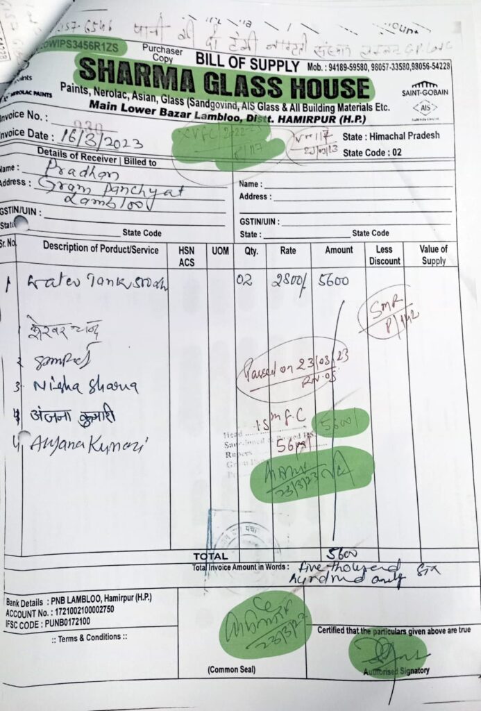 1 यह पाया गया कि पंचायत समिति ग्रांट-इन-ऐड के तहल संपादित कुछ कार्य (सूची संलग्न) ग्राम पंचायत लम्बलू द्वारा करवाए गये। उक्त कार्यों के लिए सामग्री की खरीद “शर्मा ग्लास हाउस, लम्बलू” नामक फर्म, जिसका स्वामित्व सतपाल शर्मा का है (GST रजिस्ट्रेशन सलंगन), से की गई। इन कार्यों के बिलों पर तिलक राज, सदस्य पंचायत समिति बमसन के हस्ताक्षर हैं। साथ ही साथ, इन्हीं बिलों पर अंकित पास आर्डर पर सचिव लम्बलू और प्रधान लम्बलू के हस्ताक्षर भी दर्शित हैं।