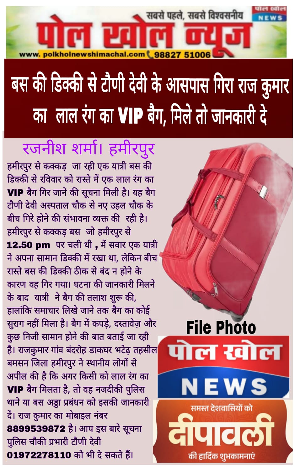हमीरपुर बस अड्डे से कुछ दिन पहले बस की डिक्की से गिरा लाल रंग का वीआईपी बैग आखिरकार मिल गया है। समाचार प्रकाशित होने के बाद पुलिस और स्थानीय लोगों की सक्रियता से बैग बरामद कर लिया गया। पोल खोल न्यूज ने सूचना मिलने पर इस बारे प्रमुखता से खबर प्रकाशित की थी।
