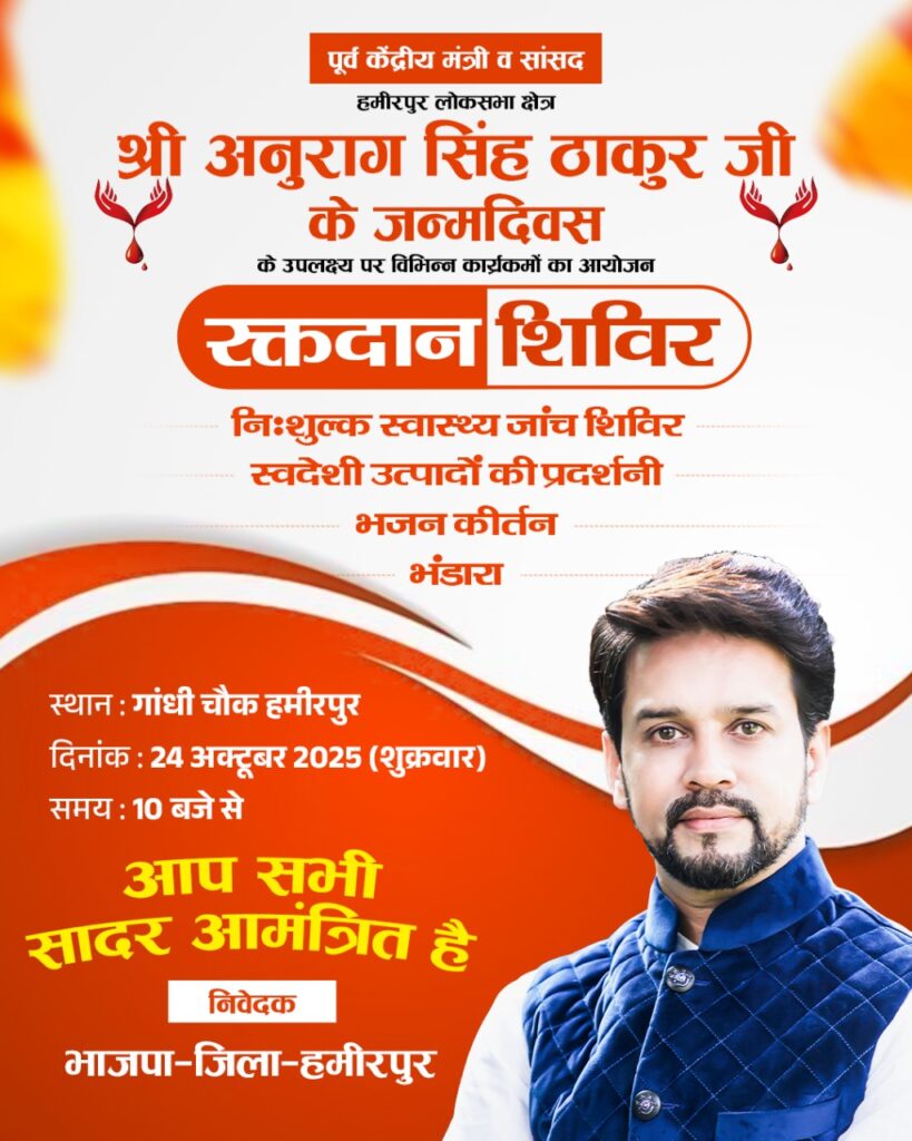 भाजपा महिला मोर्चा जिला हमीरपुर द्वारा पूर्व केंद्रीय मंत्री व हमीरपुर संसदीय क्षेत्र के सांसद अनुराग सिंह ठाकुर के जन्मदिन पर भजन-कीर्तन का आयोजन किया जा रहा है। महिला मोर्चा जिला अध्यक्ष अर्चना चौहान ने बताया कि सांसद अनुराग सिंह ठाकुर के जन्मदिन के शुभअवसर पर हमीरपुर शहर के गांधी चौक पर 24 अक्तूबर को प्रातः साढ़े 10 बजे भजन-कीर्तन आयोजित किया जाएगा। उन्होंने हमीरपुर जिले के समस्त लोगों से भजन-कीर्तन में भाग लेने की अपील की है।