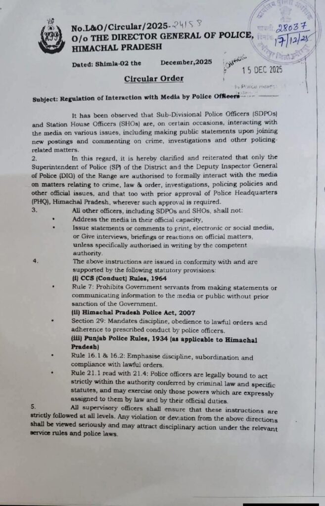 पुलिस मुख्यालय ने स्पष्ट किया है कि ये निर्देश केंद्रीय सिविल सेवा (आचरण) नियम, 1964, हिमाचल प्रदेश पुलिस अधिनियम 2007 और पंजाब पुलिस नियम 1934 के तहत दिए गए हैं। सभी अधिकारियों को अपने अधिकार क्षेत्र में रहते हुए ही कार्य करने और आदेशों का सख्ती से पालन करने के निर्देश दिए गए हैं।