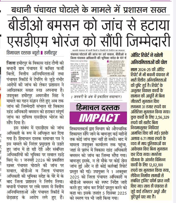 बधानी पंचायत प्रकरण में मीडिया की सतत निगरानी और जनता की आवाज़ ने यह संदेश दिया है कि अब अनियमितताओं पर पर्दा डालना आसान नहीं।