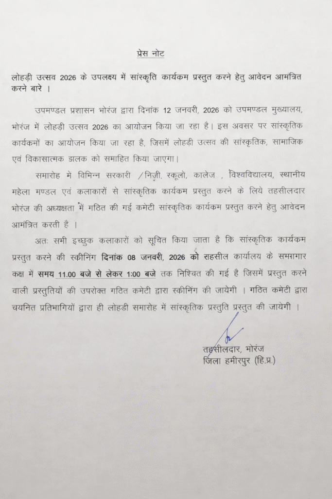 भोरंज में लोहड़ी उत्सव 2026: सांस्कृतिक प्रस्तुतियों के लिए कलाकारों से  आवेदन आमंत्रित