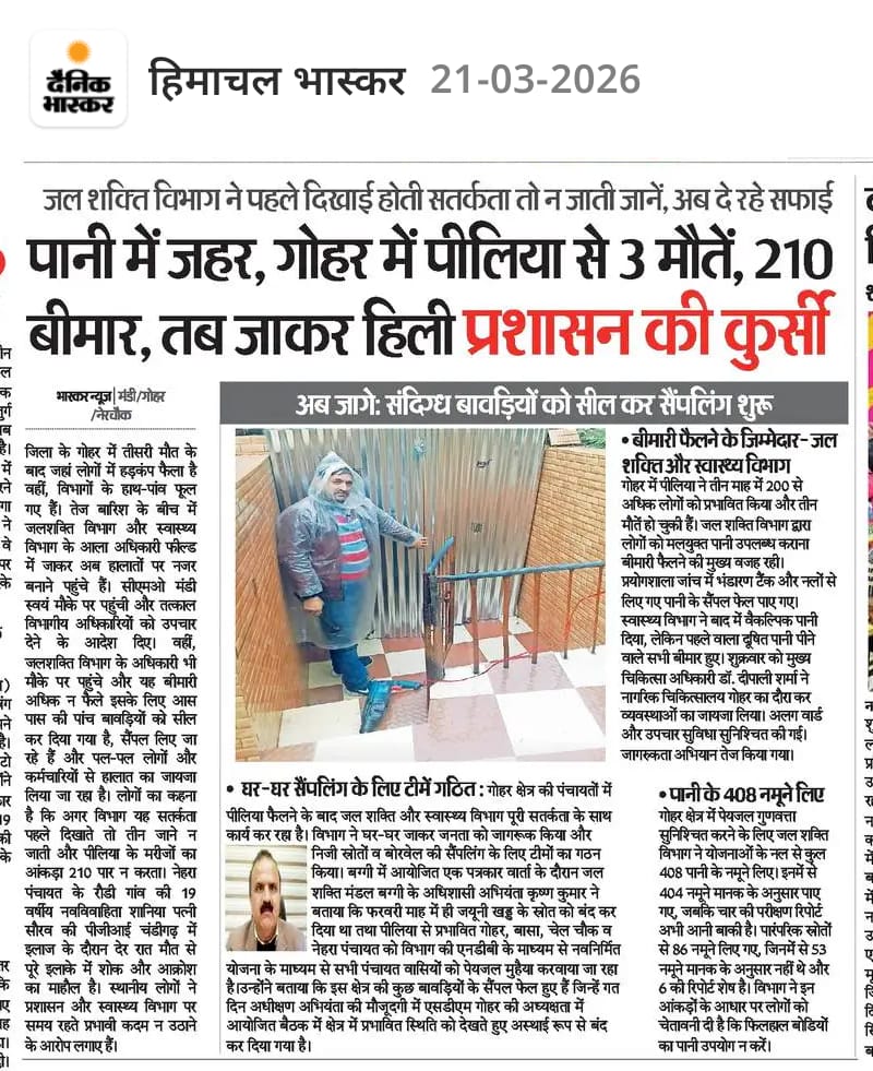 मंडी जिला के गोहर क्षेत्र में जहरीले पानी के कारण फैली बीमारी ने प्रशासन और संबंधित विभागों की कार्यप्रणाली पर गंभीर सवाल खड़े कर दिए हैं। पोलिया जैसे खतरनाक संक्रमण से 3 लोगों की मौत और 210 से अधिक लोगों के बीमार होने के बाद ही प्रशासन हरकत में आया। स्थानीय लोगों का आरोप है कि यदि समय रहते जल शक्ति विभाग और स्वास्थ्य विभाग ने सतर्कता दिखाई होती, तो इतनी बड़ी त्रासदी टाली जा सकती थी।