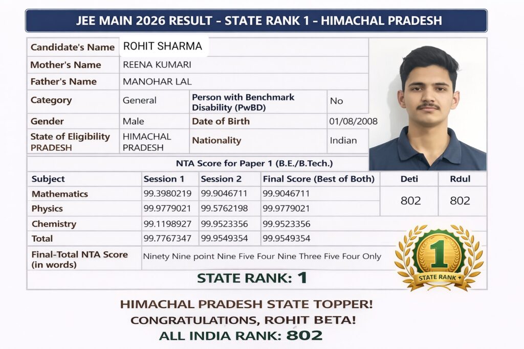 हमीरपुर के बेटे रोहित शर्मा ने रचा इतिहास, JEE Main 2026 में हिमाचल प्रदेश में किया टॉप
